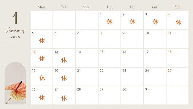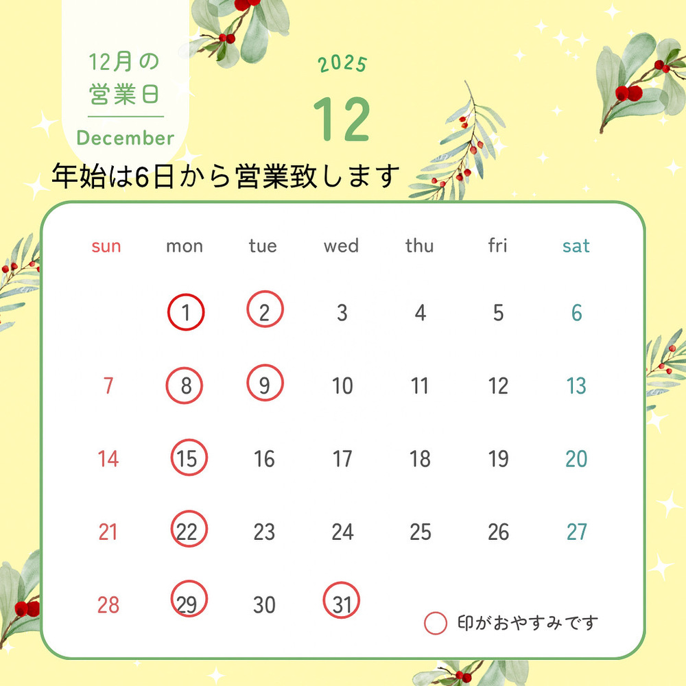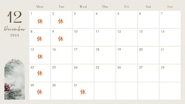 12月の休業日は、毎週月曜日、2日・9日・31日になります。